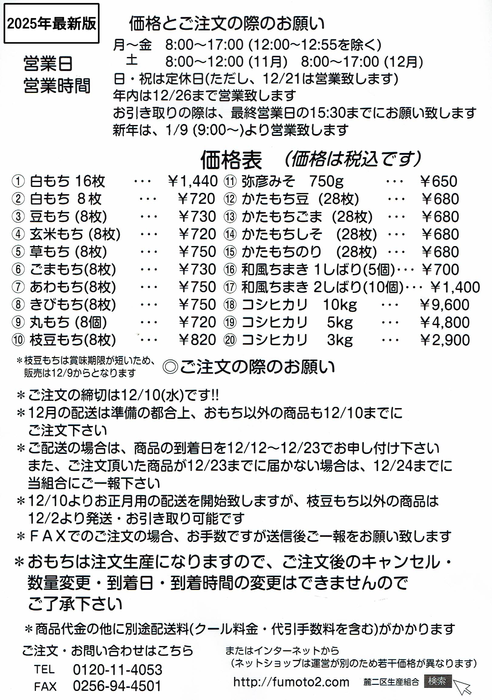 直売所(弥彦村麓)に直接買いに来られる方は下記チラシをご覧いただきご注文のお電話をお願いします。